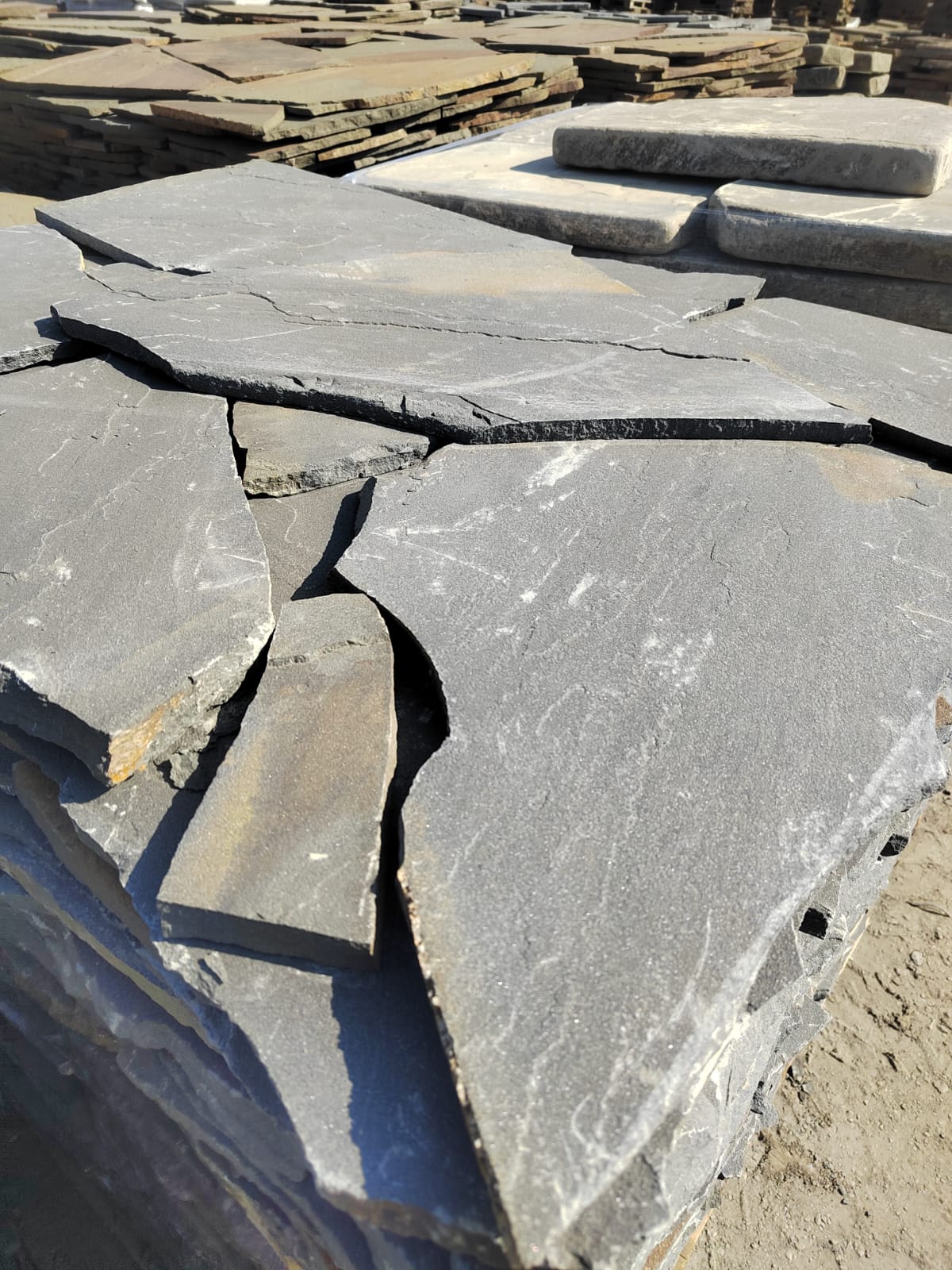 Желтые, серо-зеленые, светло-серая, красноватые и зеленоватые элементы выглядят гармонично. Такая плитка используется для ландшафтного проектирования, дорожек, беседок, площадок вокруг бассейна или пруда, для беседок в саду, облицовки, мест для барбекю и др.